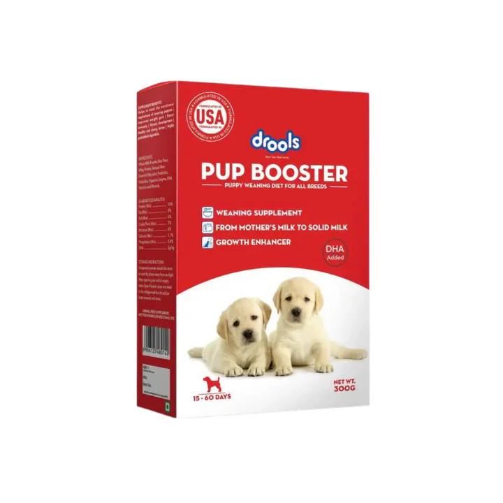 | DROOLS PUP BOOSTER 300GM | A specially formulated weaning food/powder for puppies of all breeds, designed to support puppies as they transition from mother’s milk to solid food. It contains a mix of essential nutrients like whey protein, DHA, vitamins, minerals, prebiotics and probiotics to help healthy growth, immunity, digestion, bone & brain development in puppies from about 15 days to 2 months old. |