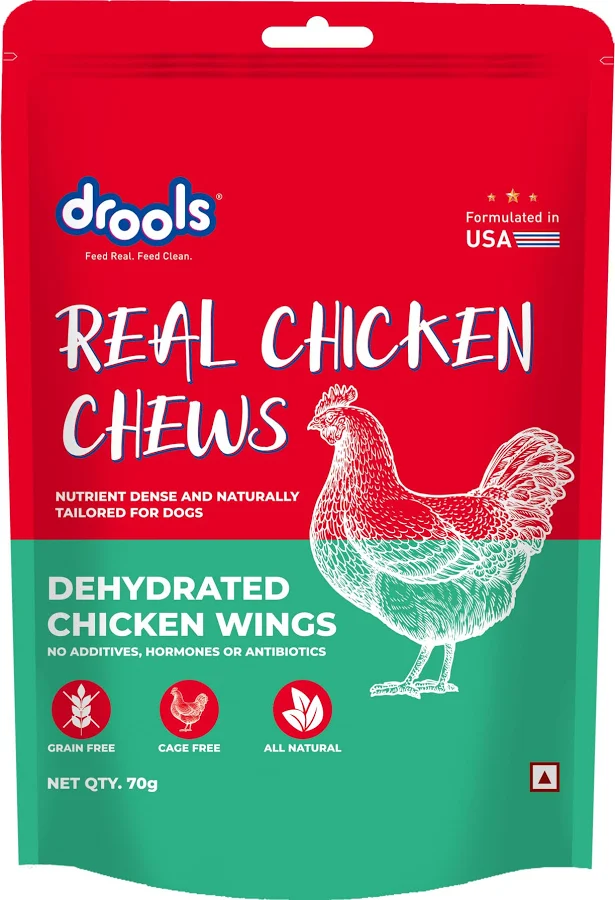 Drools Dehydrated Real Chicken Wing Chews (70 g) are wholesome and minimally processed dog treats made from 100 % real chicken wings gently dehydrated to lock in nutrients and flavour. These chews contain no additives, antibiotics, hormones or grains, making them a natural, high‑protein snack suitable for dogs of all sizes and life stages