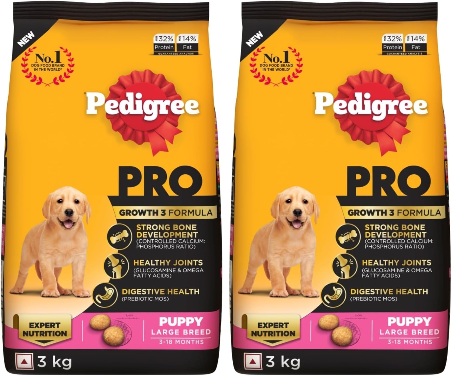 | PED PRO PUPPY LARGE BREED 3KG | Pedigree PRO Puppy Large Breed 3 kg is a complete dry dog food specially formulated for large breed puppies (3 – 18 months old). It provides balanced nutrition with high-quality proteins, essential vitamins, minerals and joint-supporting nutrients to help support healthy growth, bone & joint development, digestion, immunity and overall wellbeing during the crucial puppy stage. |